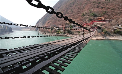 泸定桥建于清康熙年间,是大渡河上建造最早最长的一座桥梁。这座悬挂式铁索桥桥身由13根铁链组成,下边9根作为底链,两边4根作为扶手,桥长103.67米,桥宽3米。