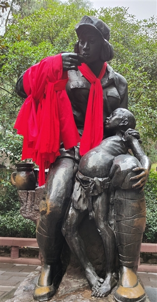 遵义人称为“红军菩萨”的女红军卫生员铜像上,系着群众缅怀烈士的红绸,很多本地群众定期来祭扫,这是遵义人民对红军的感情。