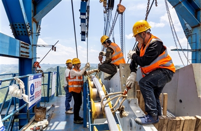 2024年7月,工人在贵州花江峡谷大桥6号主塔进行主缆索股架设施工,大桥缆索由贵州钢绳股份有限公司研制。(新华社/图)
