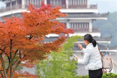 市民在仁怀市楠竹林公园观赏红叶(遵义图库·陈勇/摄)