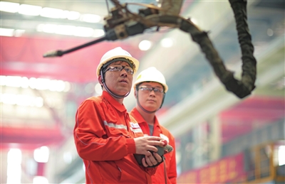 全国五一劳动奖章获得者、海洋石油工程股份有限公司的电焊工首席技师刘海林(左),在海油工程天津智能制造基地结构预制车间调试焊接机器人。(新华社/图)