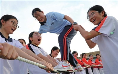 在山东省滨州市博兴县第一中学,高三学生做动力圈游戏“齐心协力”。高考临近,各地学校组织高三学生开展不同形式的减压活动,帮助学生放松心情,迎接高考。(新华社/图)