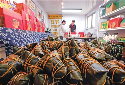 5月22日,工人在河北省遵化市兴旺寨镇的一家食品厂包装车间工作。端午节临近,粽子厂家和老字号酒店纷纷赶制粽子,满足市场需求。(新华社/图)