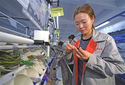 工人在道真自治县上玉工业园区一家生产汽车线束总成的企业组装线束总成(新华社/图)