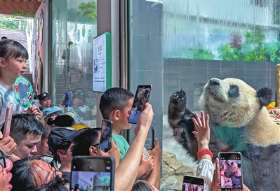 6月15日,市民、游客在温州动物园熊猫馆观看、拍摄大熊猫。 当日,从比利时归国的大熊猫 “宝弟”和“宝妹”在浙江省温州动物园熊猫馆与市民、游客见面。(新华社/图)