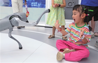 9月7日,在位于江苏省徐州市云龙区的一家科学探索馆,小朋友与机器狗互动。今年9月是首个全国科普月,各地青少年参观科技场馆、体验科普设备,感受科技魅力。(新华社/图)